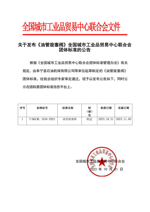 我公司團(tuán)體標(biāo)準(zhǔn)油管旋塞閥的發(fā)布